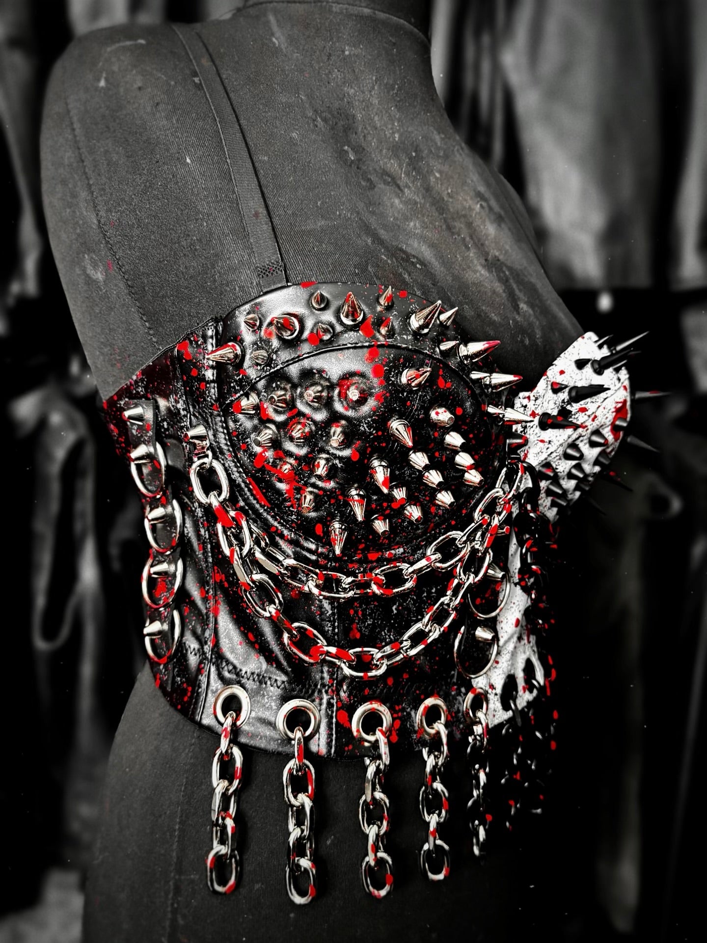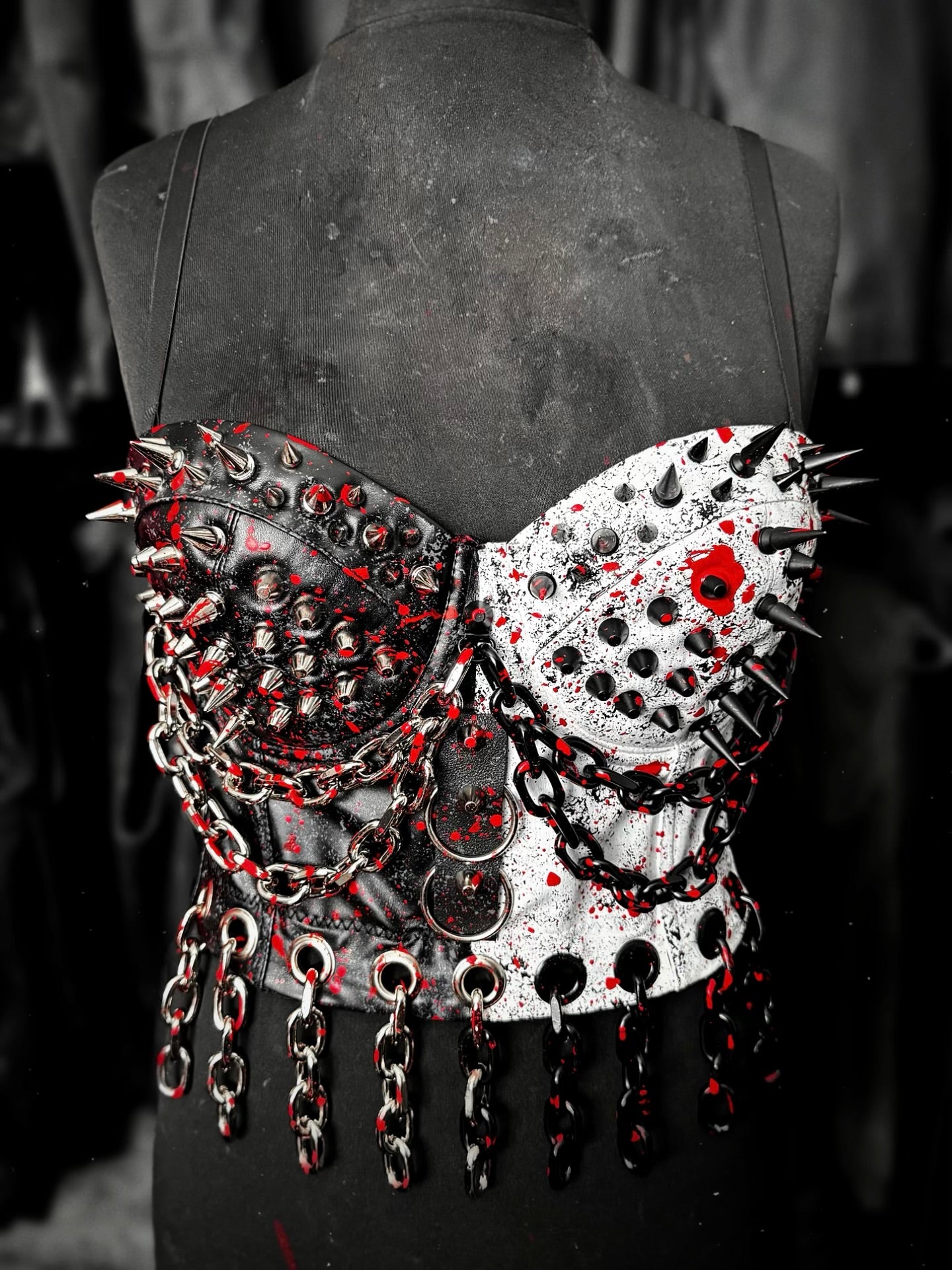 ART THE CLOWN FAUX LEATHER BUSTIER - BASED ON THE TERRIFIER JACKET WE CREATED FOR RHEA RIPLEY.  BLACK AND WHITE THEMED WITH SILVER AND BLACK HARDWARE FINISHED WITH BLOOD SPATTERS THROUGHOUT